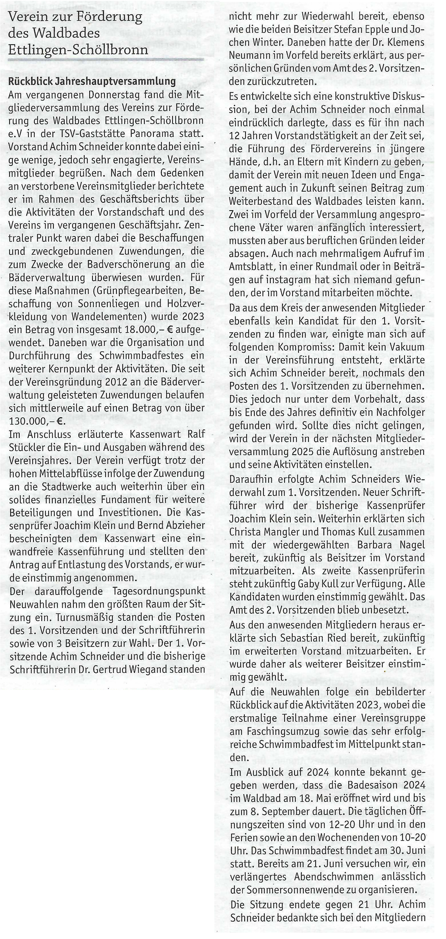 25. April 2024 Amtsblatt: Rückblick Jahreshauptversammlung