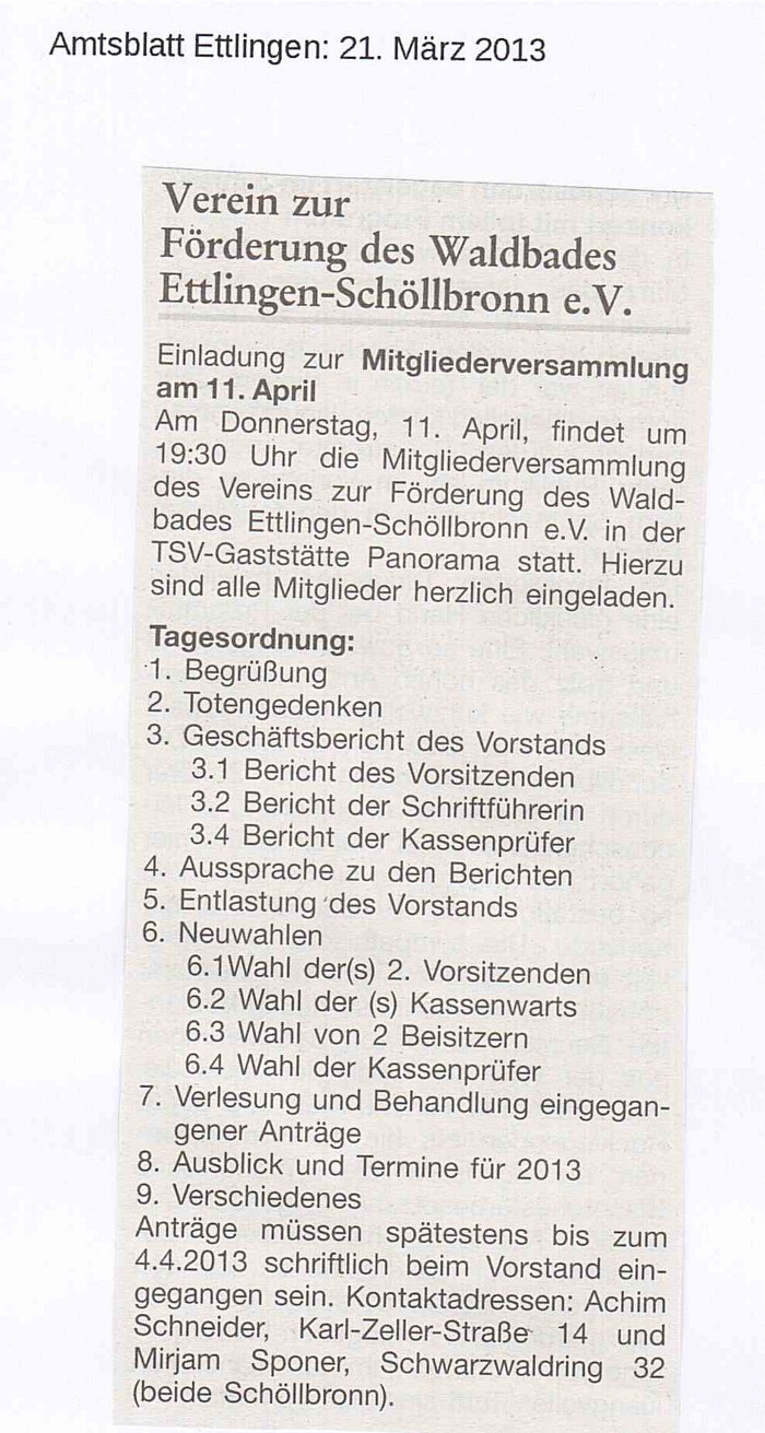 21. März 2013 Amtsblatt Ettlingen: Einladung zur Mitgliederversammlung am 11. April