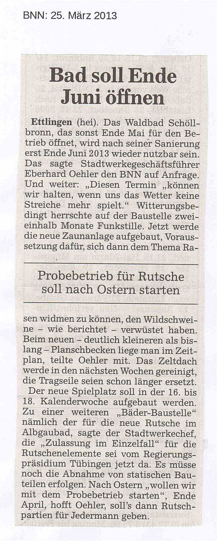 25. März 2013 BNN: Bad soll Ende Juni öffnen