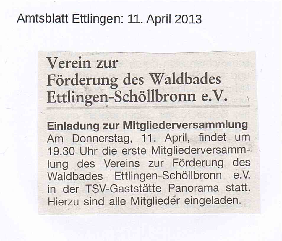 11. April 2013 Amtsblatt Ettlingen: Einladung zur Mitgliederversammlung