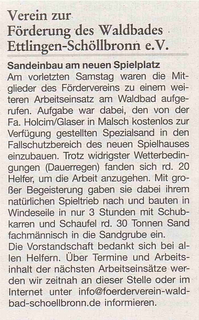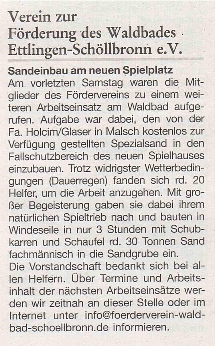 9. Mai 2013 Amtsblatt Ettlingen: Sandeinbau am neuen Spielplatz