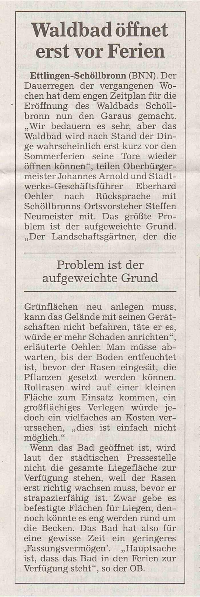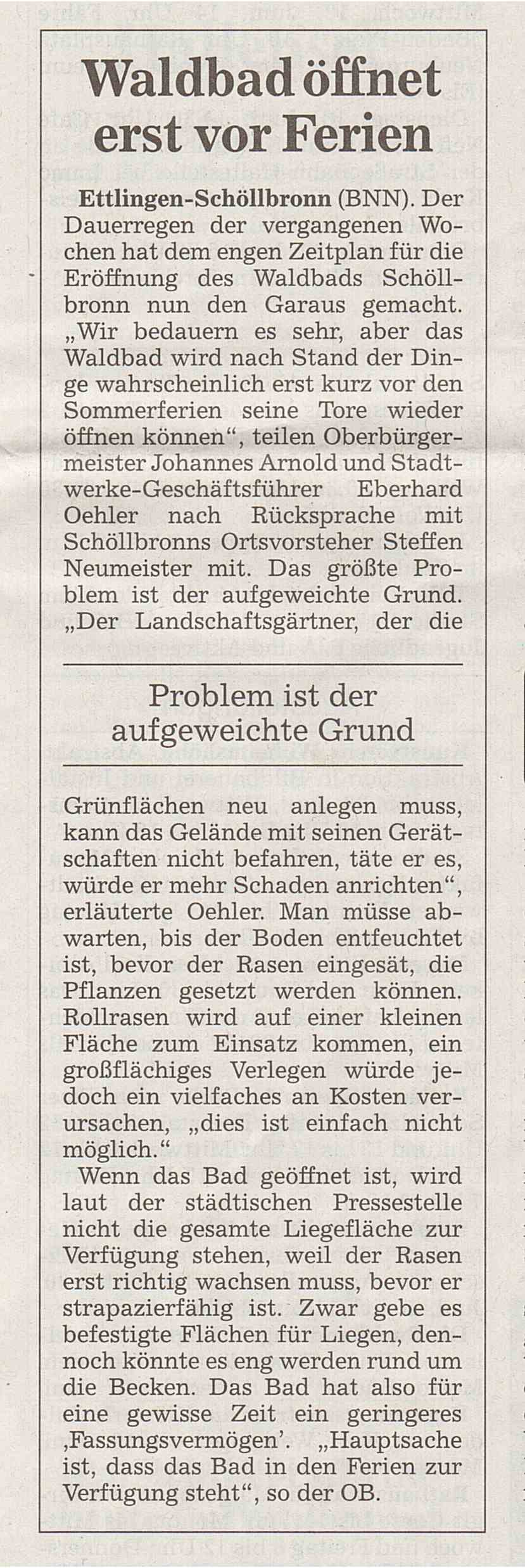 7. Juni 2013 BNN: Waldbad öffnet erst vor Ferien