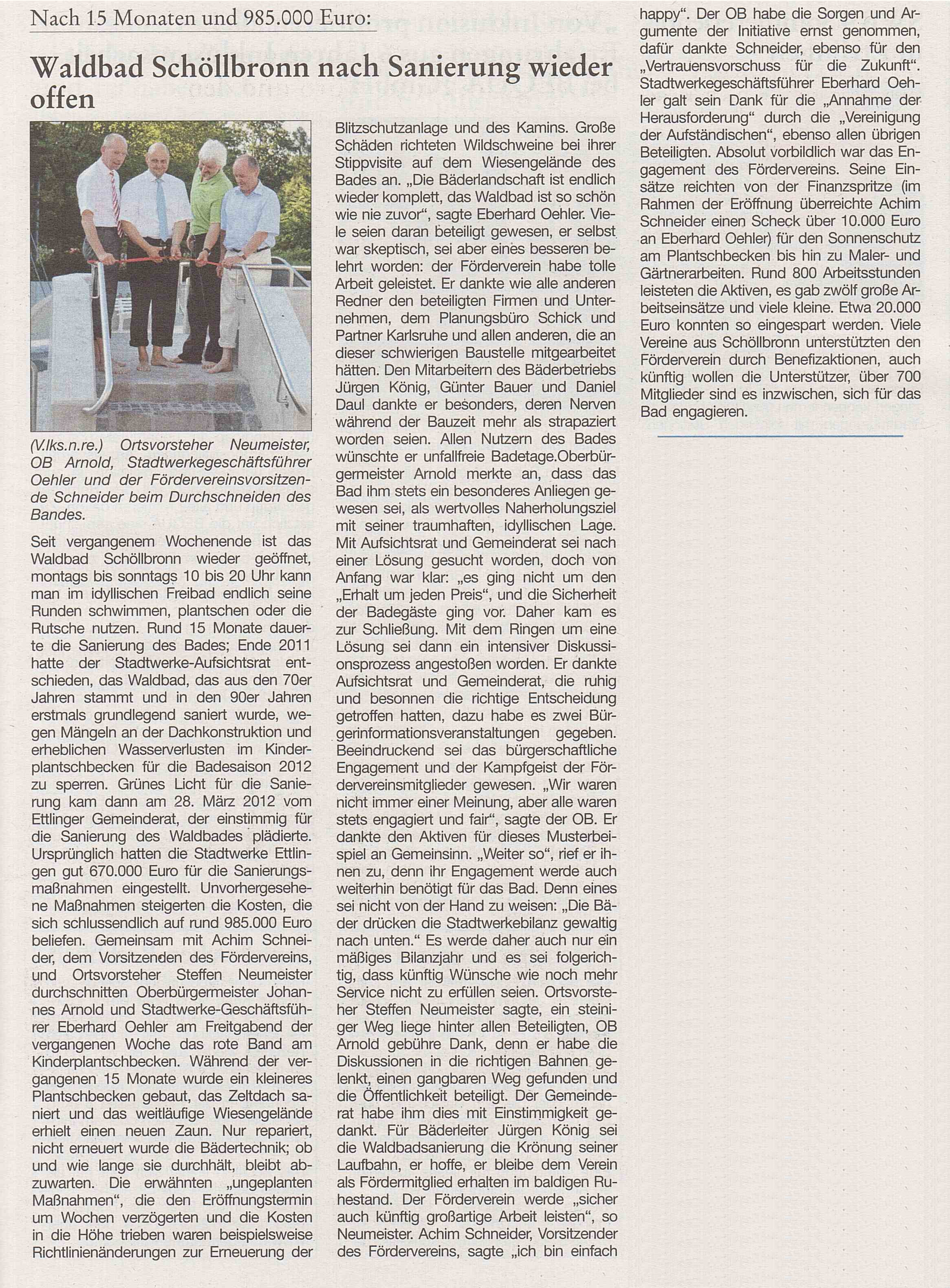 25. Juli 2013 Amtsblatt Ettlingen: Waldbad Schöllbronn nach Sanierung wieder offen