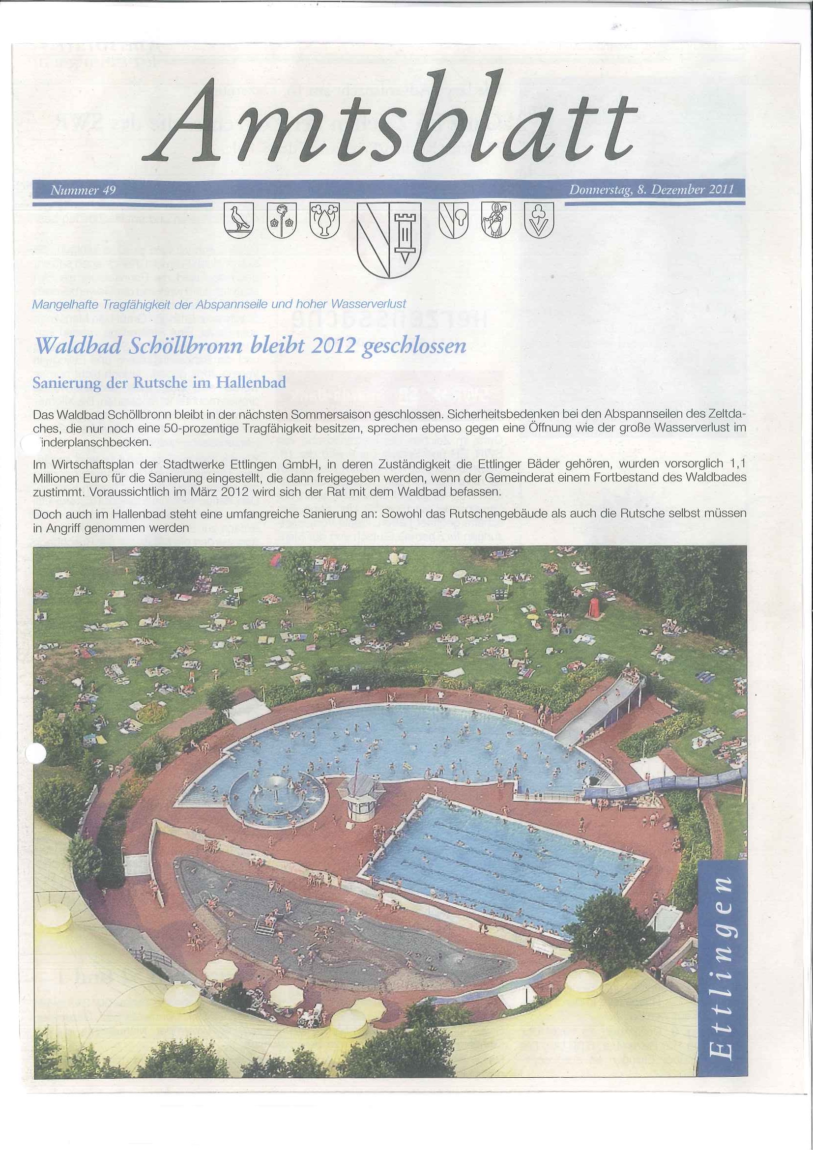 Beitragsseiten 8. Dezember 2011 Amtsblatt Ettlingen: Waldbad Schöllbronn bleibt 2012 geschlossen / Sicherheitsgründe und Wasserverlust Sicherheitsgründe und Wasserverlust Alle Seiten Seite 1 von 2Amtsblatt Ettlingen: Waldbad Schöllbronn bleibt 2012 geschlossen! Originalgröße Weiter