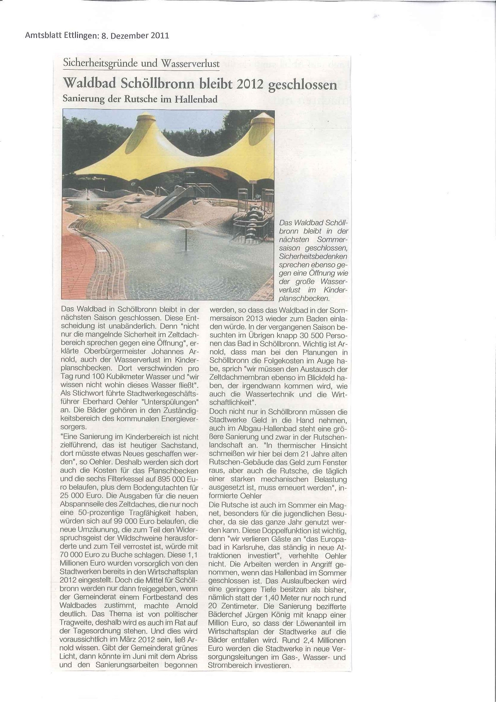Amtsblatt Ettlingen: Waldbad Schöllbronn bleibt 2012 geschlossen! Originalgröße Amtsblatt Ettlingen: Sicherheitsgründe und Wasserverlust Originalgröße