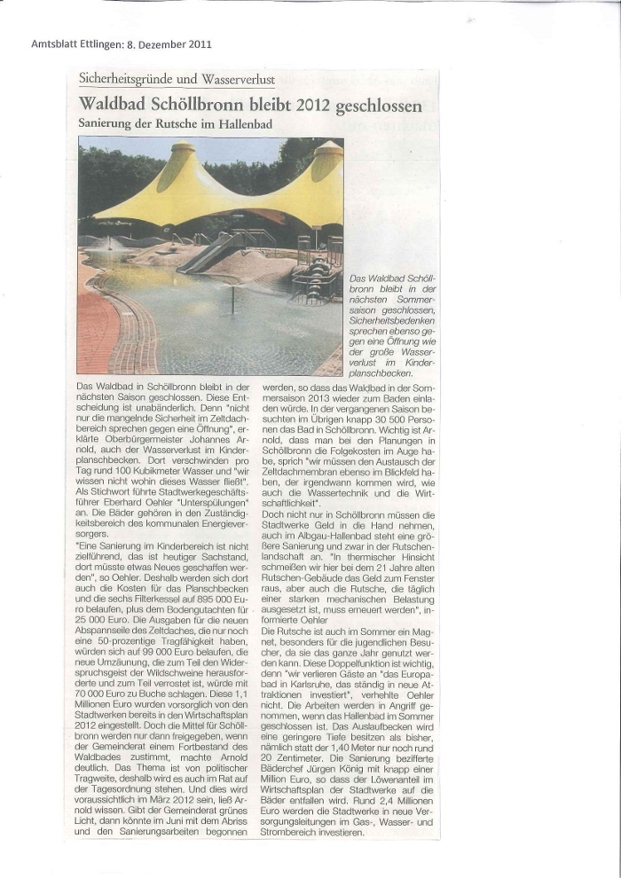 8. Dezember 2011 Amtsblatt Ettlingen: Waldbad Schöllbronn bleibt 2012 geschlossen / Sicherheitsgründe und Wasserverlust