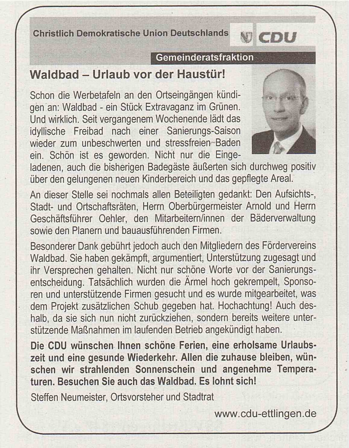25. Juli 2013 Amtsblatt Ettlingen: Waldbad - Urlaub vor der Haustür