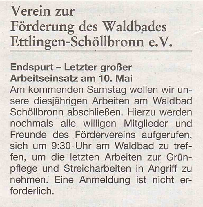 08. Mai 2014 Amtsblatt Ettlingen: Endspurt - Letzter großer Arbeitseinsatz am 10. Mai