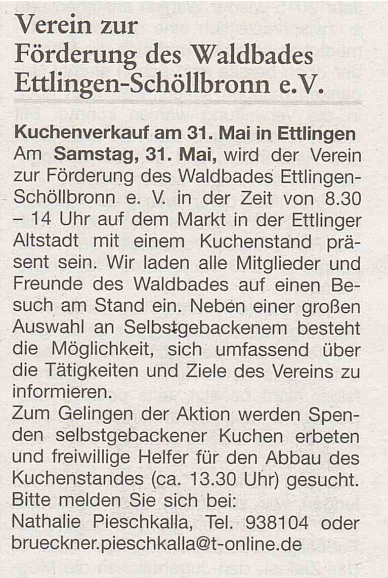 15. Mai 2014 Amtsblatt Ettlingen: Kuchenverkauf am 31. Mai in Ettlingen