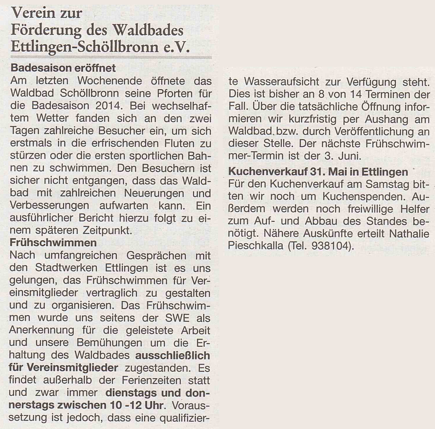 28. Mai 2014 Amtsblatt Ettlingen: Badesaison eröffnet / Frühschwimmen / Kuchenverkauf am 31. Mai in Ettlingen