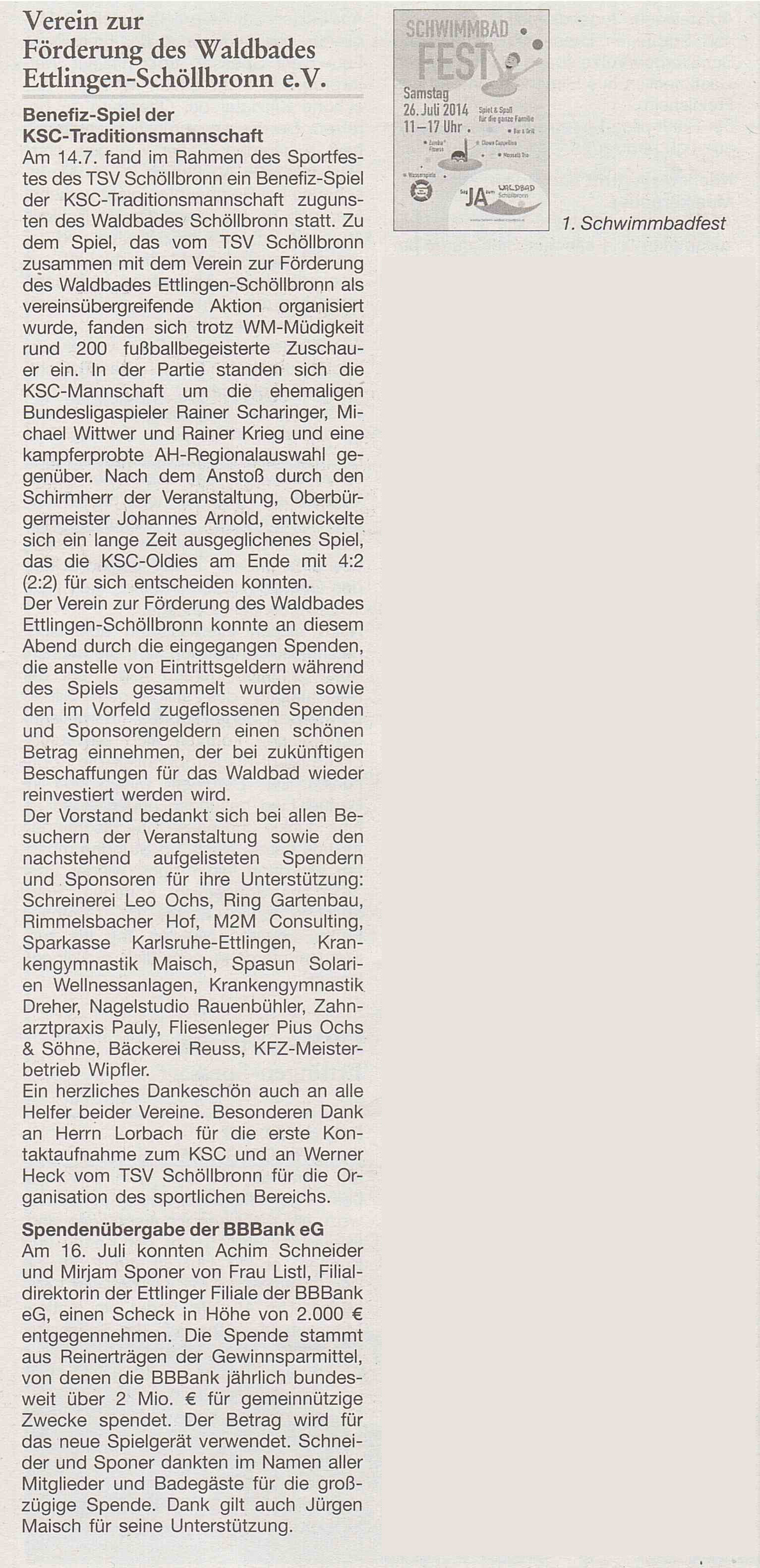 24. Juli 2014 Amtsblatt Ettlingen: Benefiz-Spiel der KSC-Traditionsmannschaft / Spendenübergabe der BBBank eG