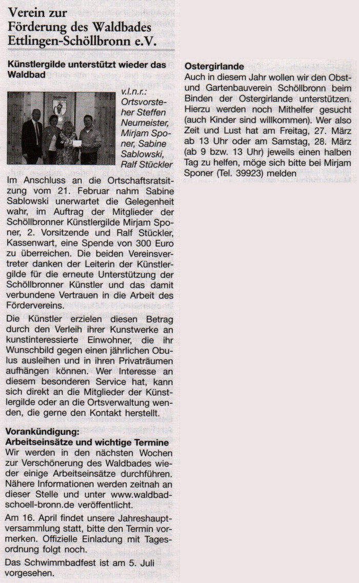 Aktuelle Seite: StartseitePresse12. März 2015 Amtsblatt Ettlingen: Künstlergilde unterstützt wieder das Waldbad / Vorankündigung: Arbeitseinsätze und wichtige Termine / Ostergirlande