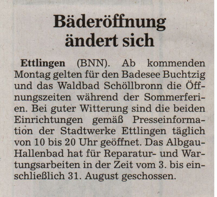 22. Juli 2015 BNN: Bäderöffnung ändert sich