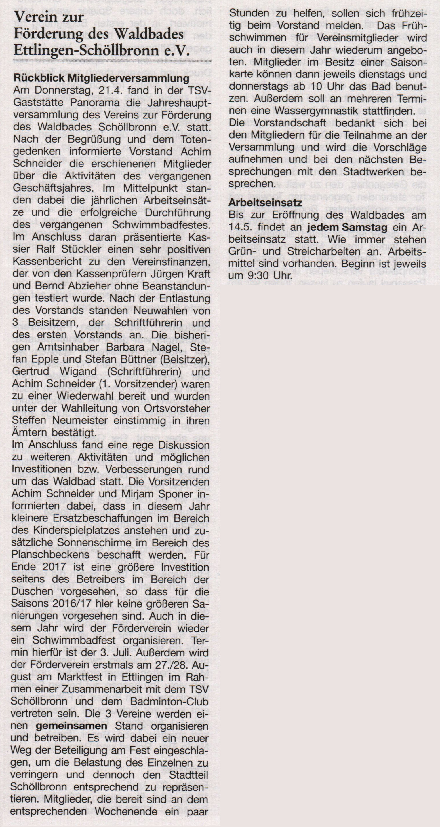 28. April 2016 Amtsblatt Ettlingen: Rückblick Mitgliederversammlung / Arbeitseinsatz