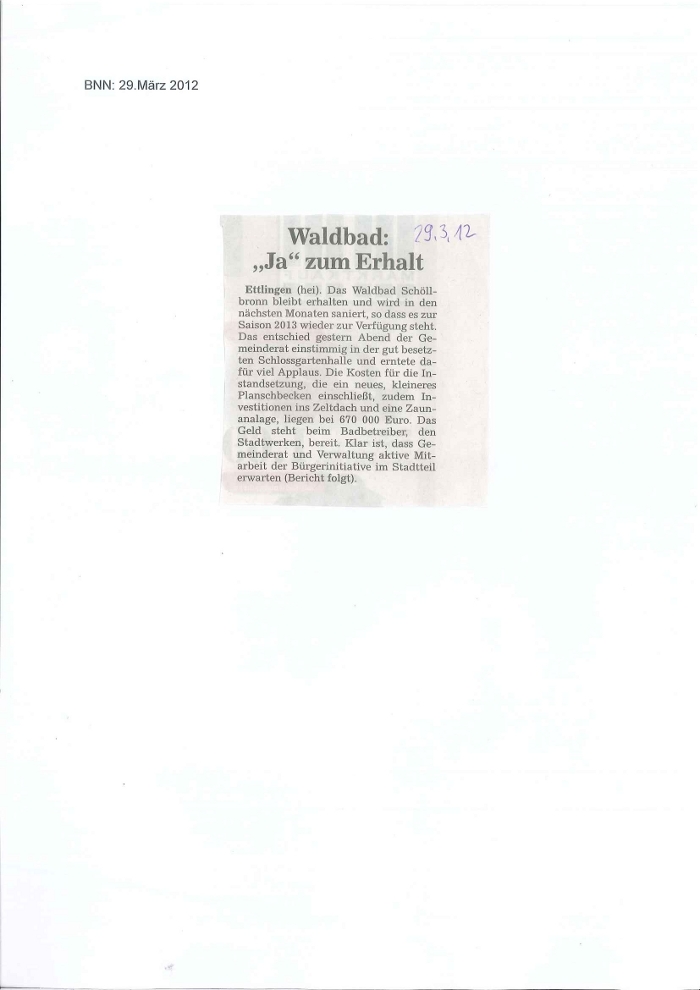 29. März 2012 BNN: Waldbad: "Ja" zum Erhalt