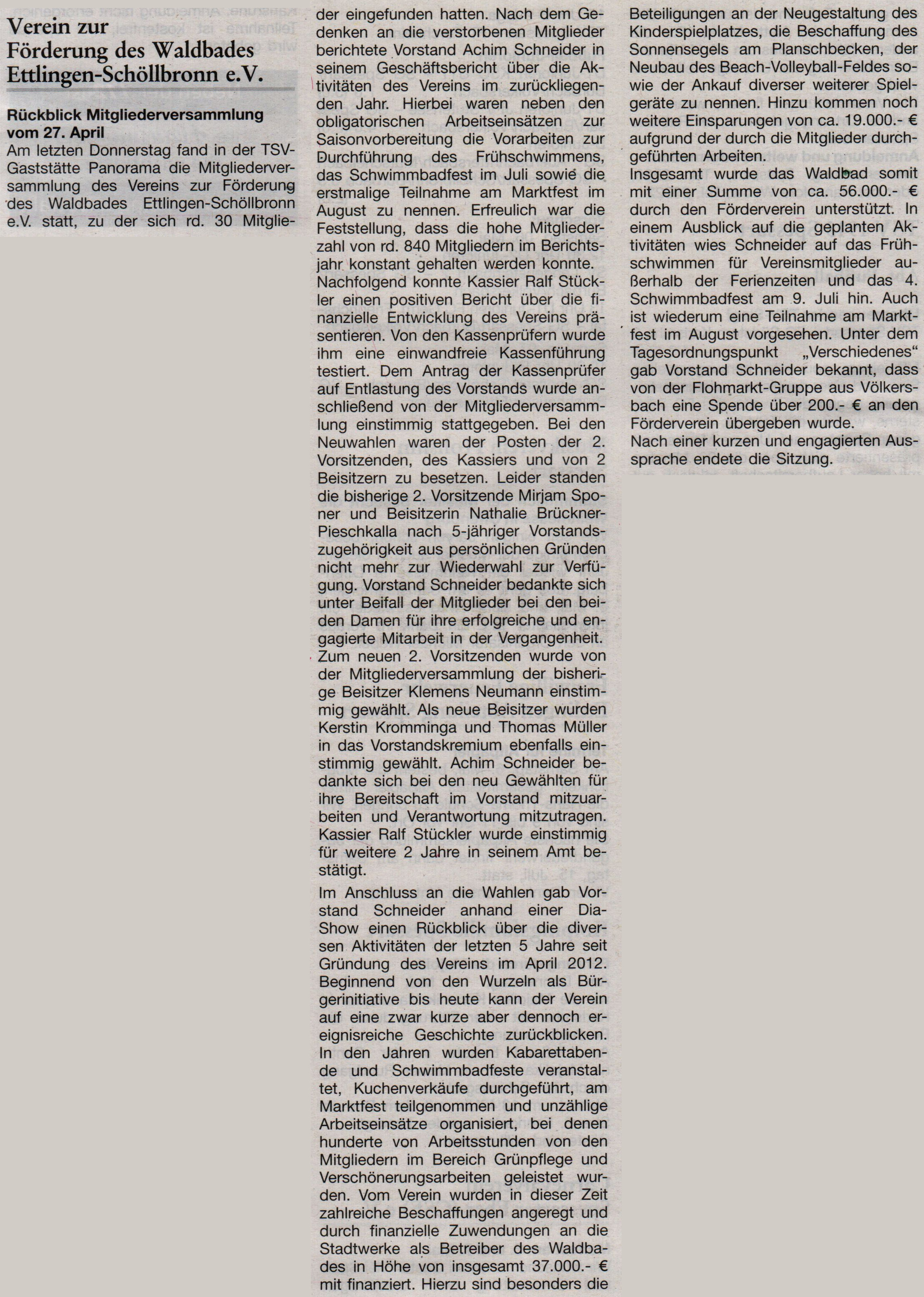 04. Mai 2017 Amtsblatt Ettlingen: Rückblick Mitgliederversammlung vom 27. April