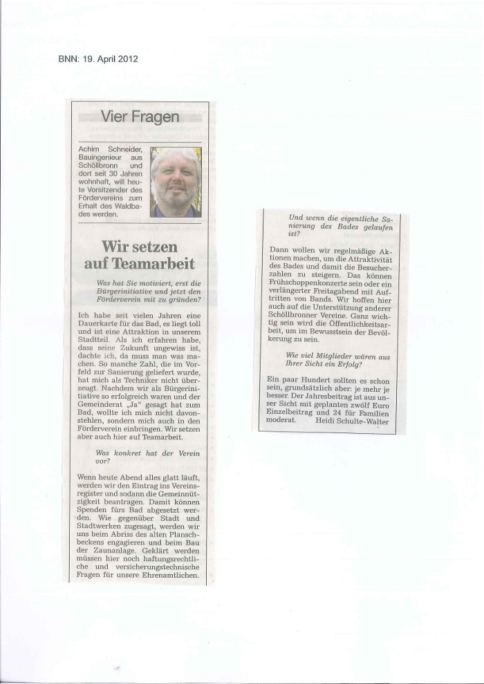 BNN: Heute Gründung von Förderverein Originalgröße BNN: Vier Fragen: Wir setzen auf Teamarbeit Originalgröße