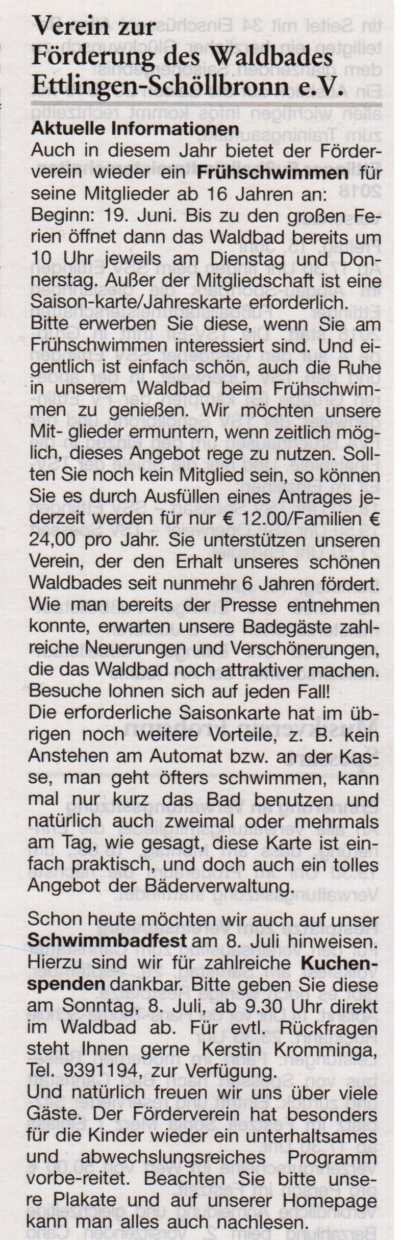 14. Juni 2018 Amtsblatt: Aktuelle Informationen / Frühschwimmen / Schwimmbadfest