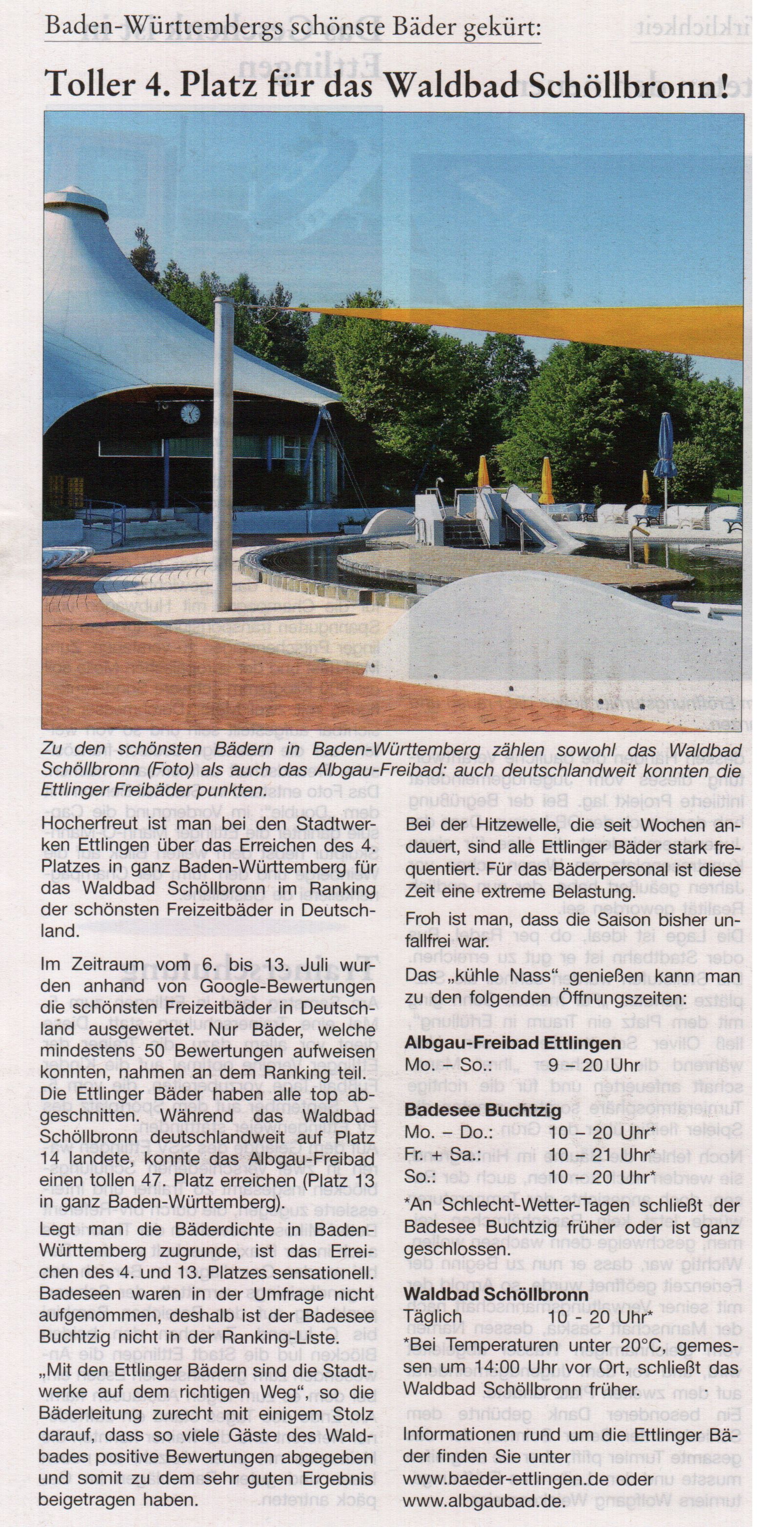 02. August 2018 Amtsblatt: Toller 4. Platz für das Waldbad Schöllbronn!