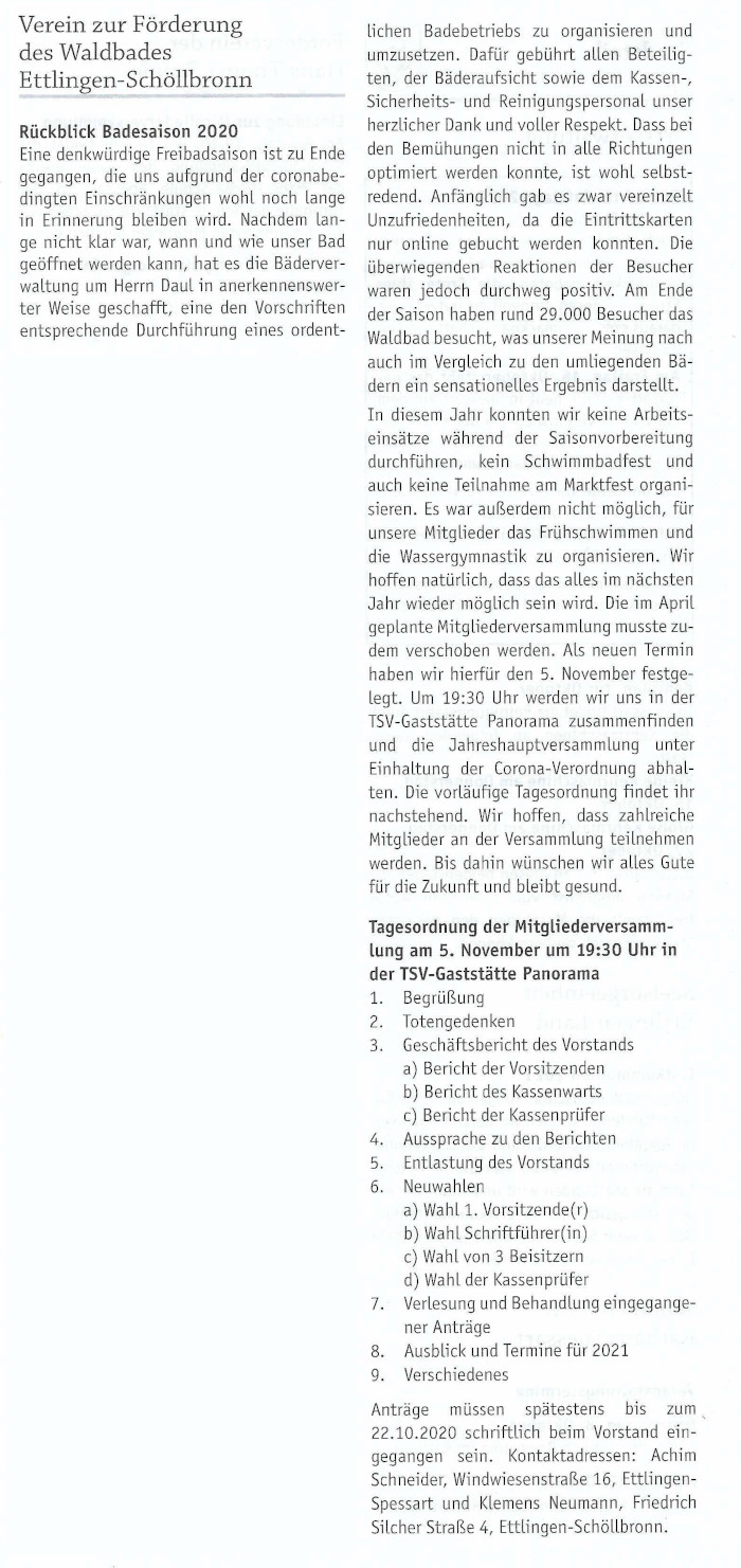 08. Oktober 2020 Amtsblatt: Rückblick Badesaison 2020 / Mitgliederversammlung 2020
