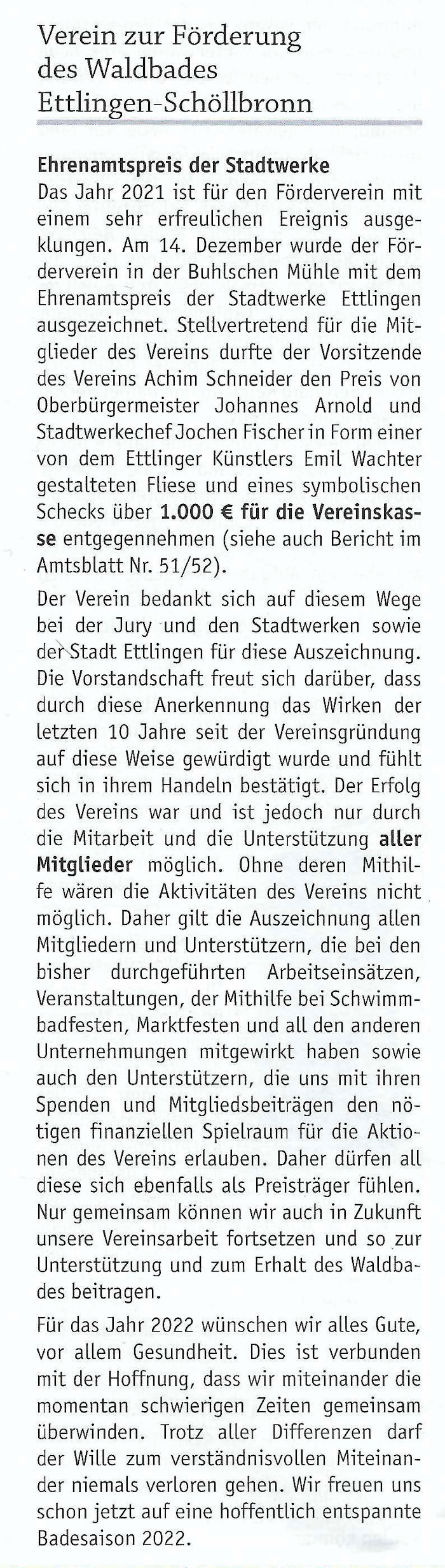 13. Januar 2022 Amtsblatt: Ehrenamtspreis der Stadtwerke