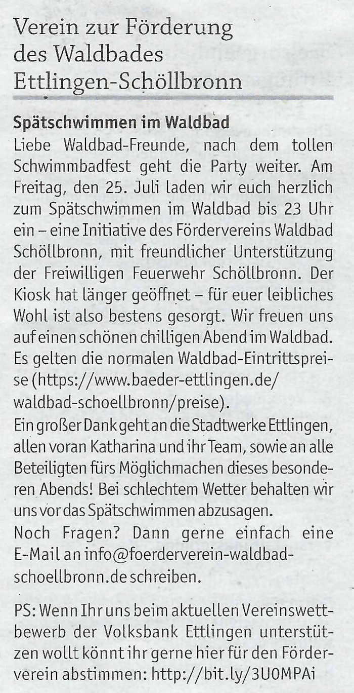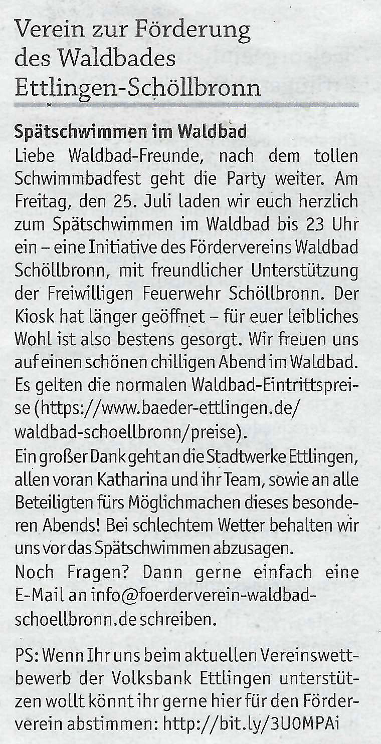17. Juli 2025 Amtsblatt: Spätschwimmen im Waldbad