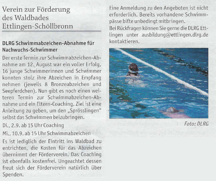 28. August 2025 Amtsblatt: DLRG Schwimmabzeichen-Abnahme für Nachwuchs-Schwimmer