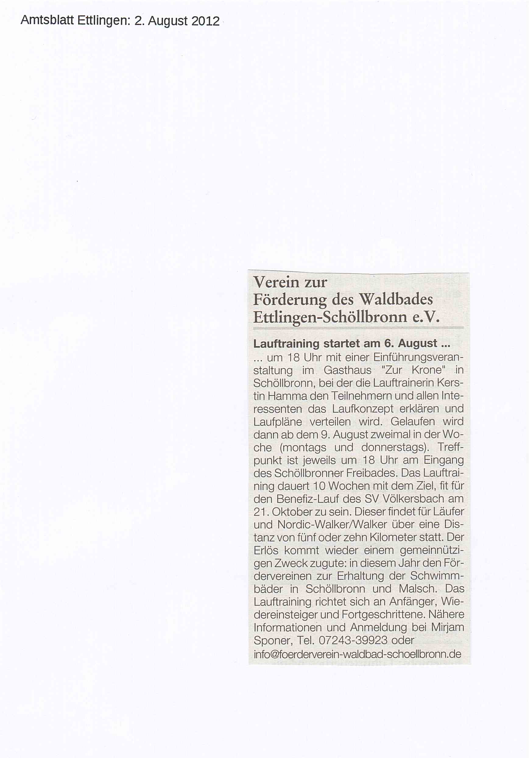 2. August 2012 Amtsblatt Ettlingen: Lauftraining startet am 6. August