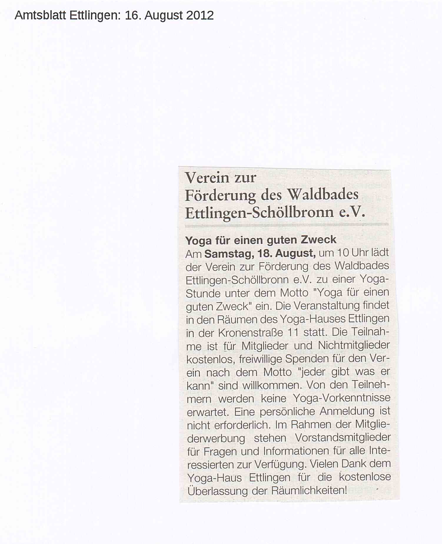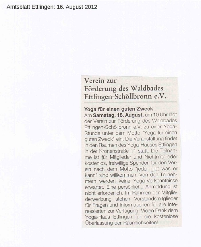 16. August 2012 Amtsblatt Ettlingen: Yoga für einen guten Zweck