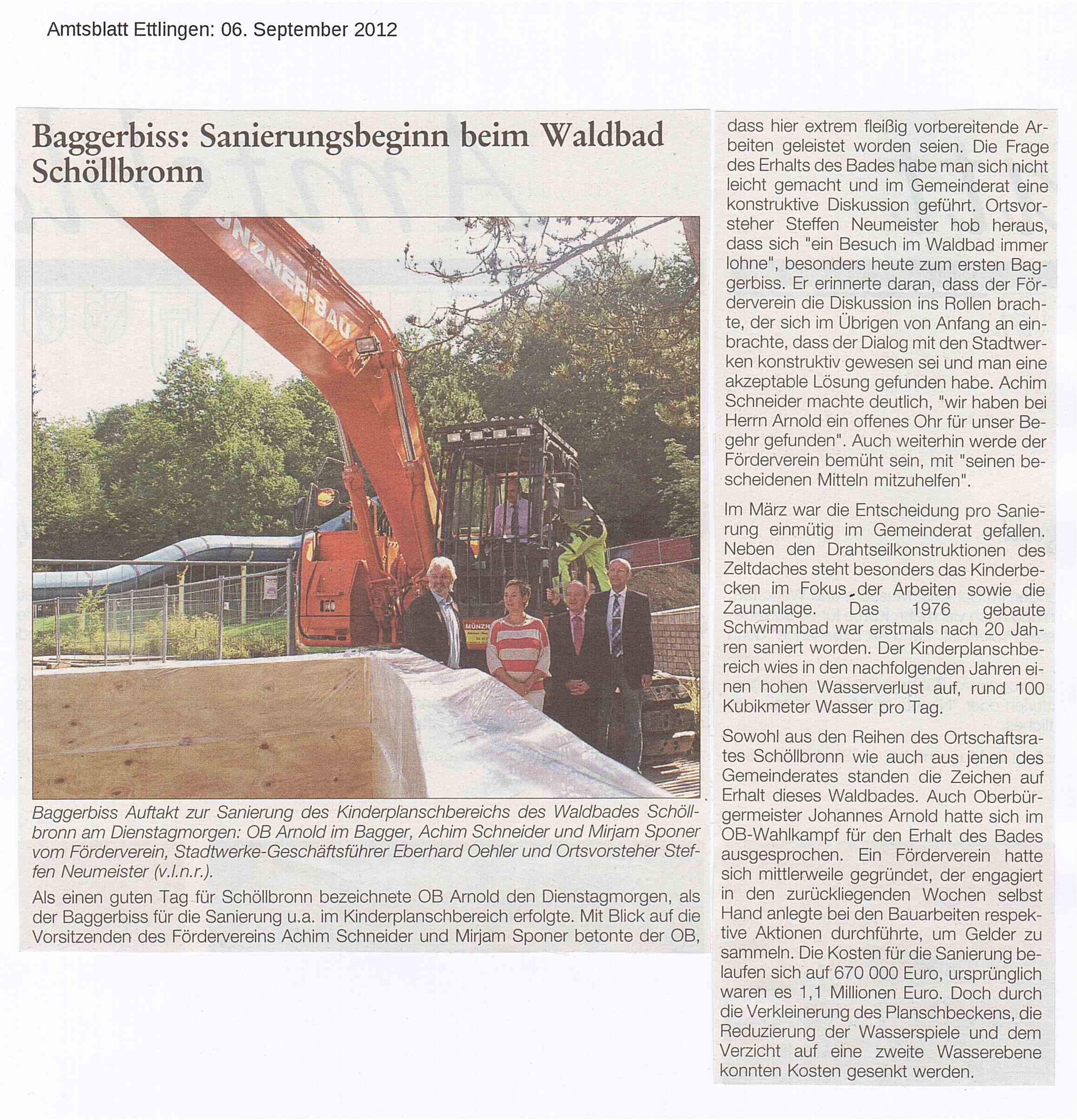 6. September 2012 Amtsblatt Ettlingen: Baggerbiss: Sanierungsbeginn beim Waldbad Schöllbronn
