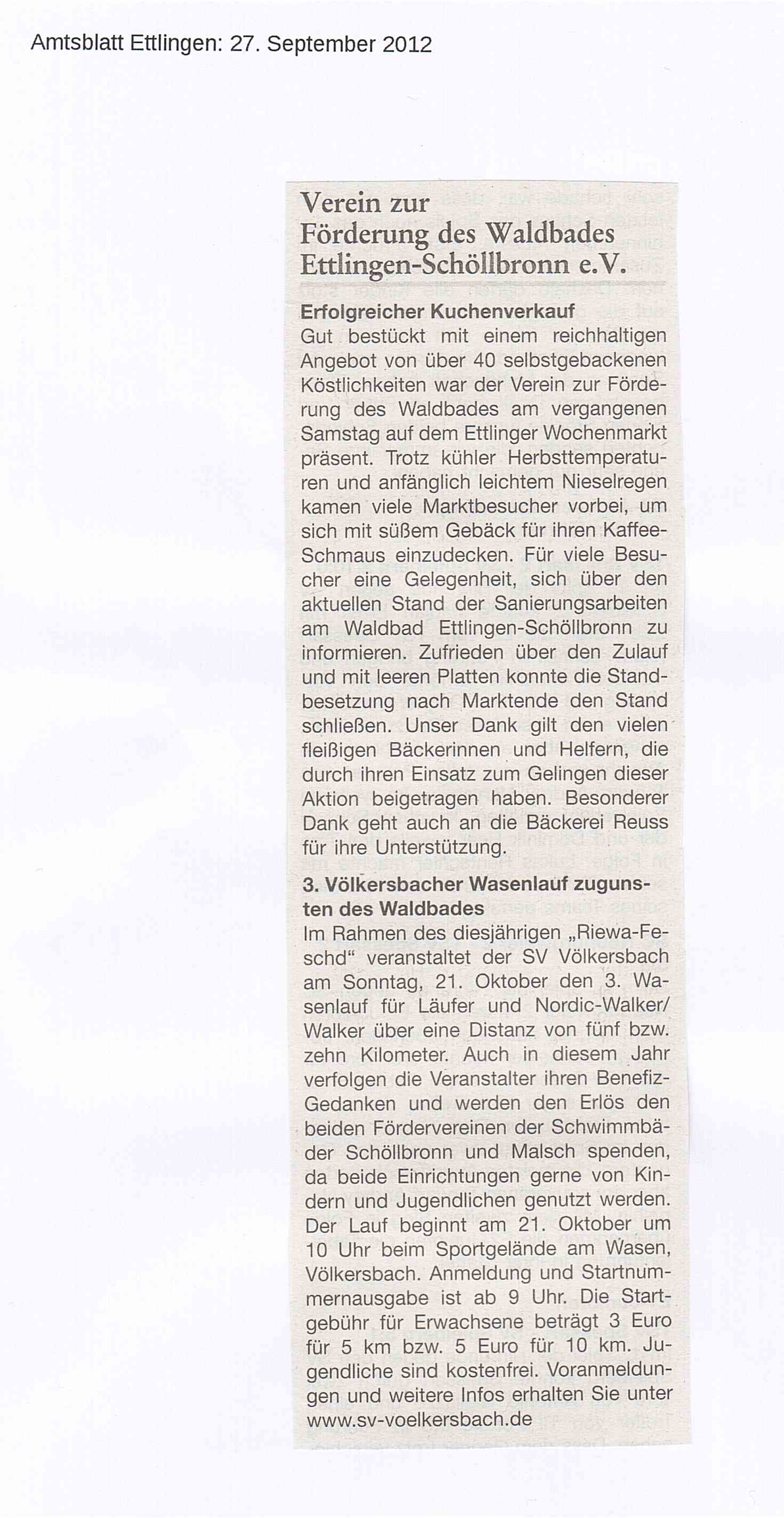 27. September 2012 Amtsblatt Ettlingen: Erfolgreicher Kuchenverkauf / 3. Völkersbacher Wasenlauf zugunsten des Waldbades