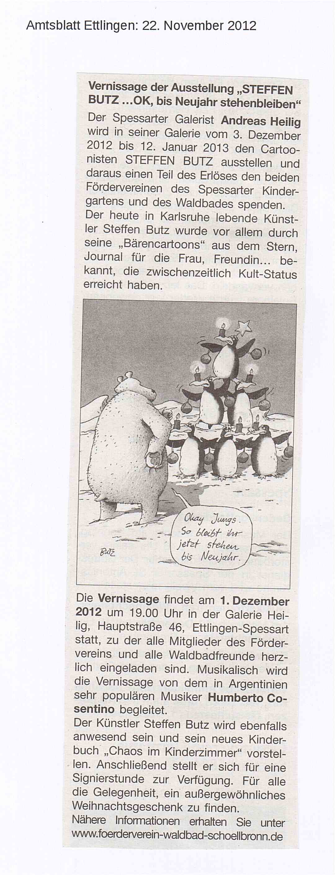 22. November 2012 Amtsblatt Ettlingen: Vernissage der Austellung "STEFFEN BUTZ ...OK, bis Neujahr stehenbleiben"