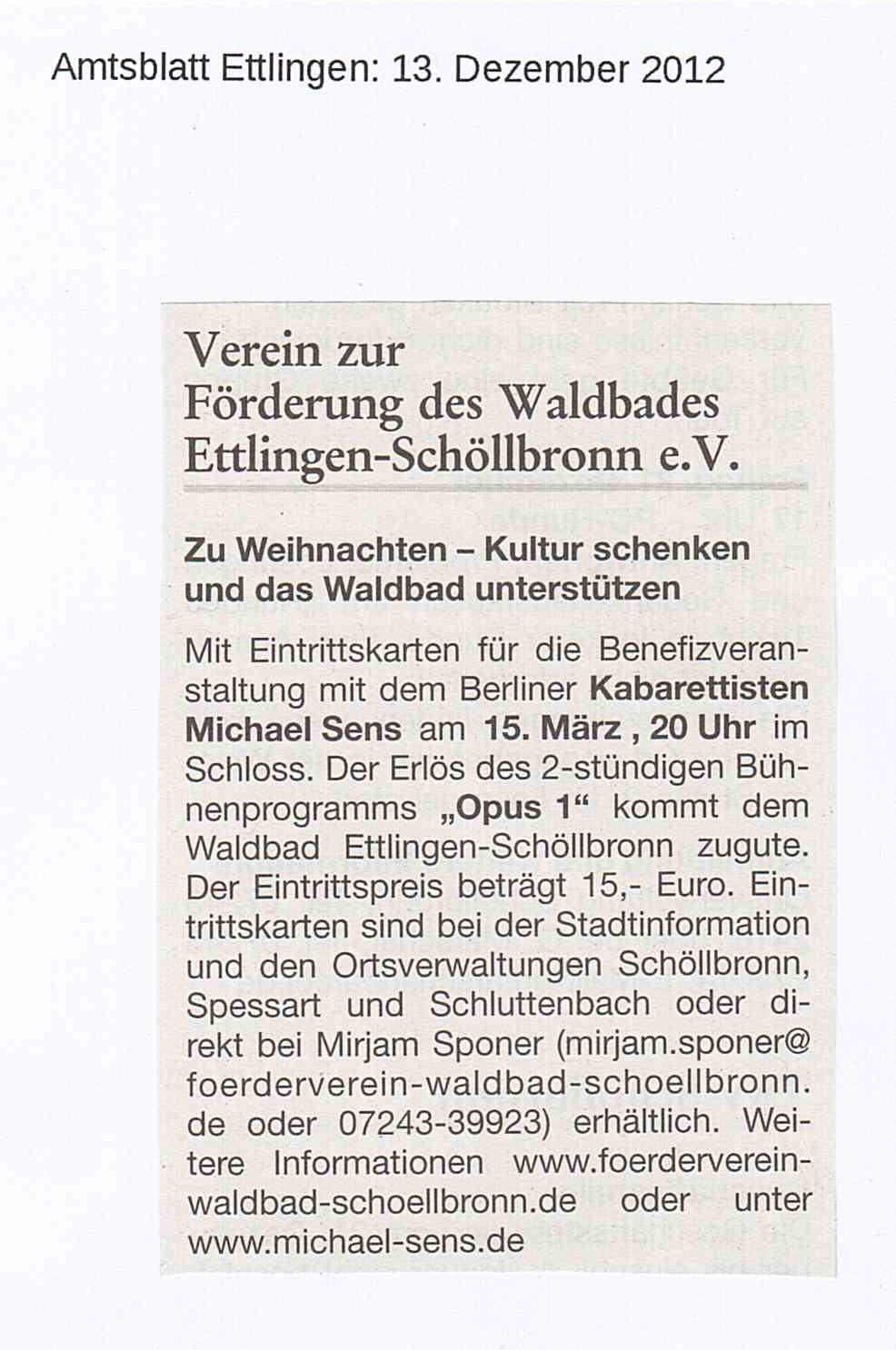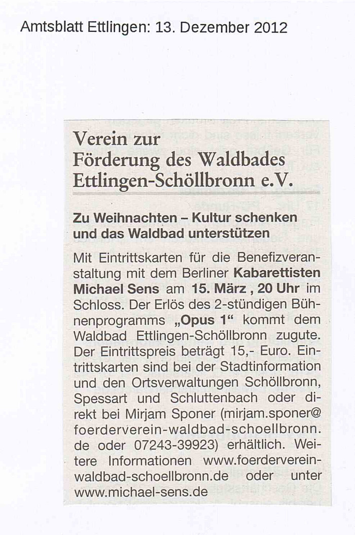 13. Dezember 2012 Amtsblatt Ettlingen: Zu Weihnachten - Kultur schenken und das Waldbad unterstützen