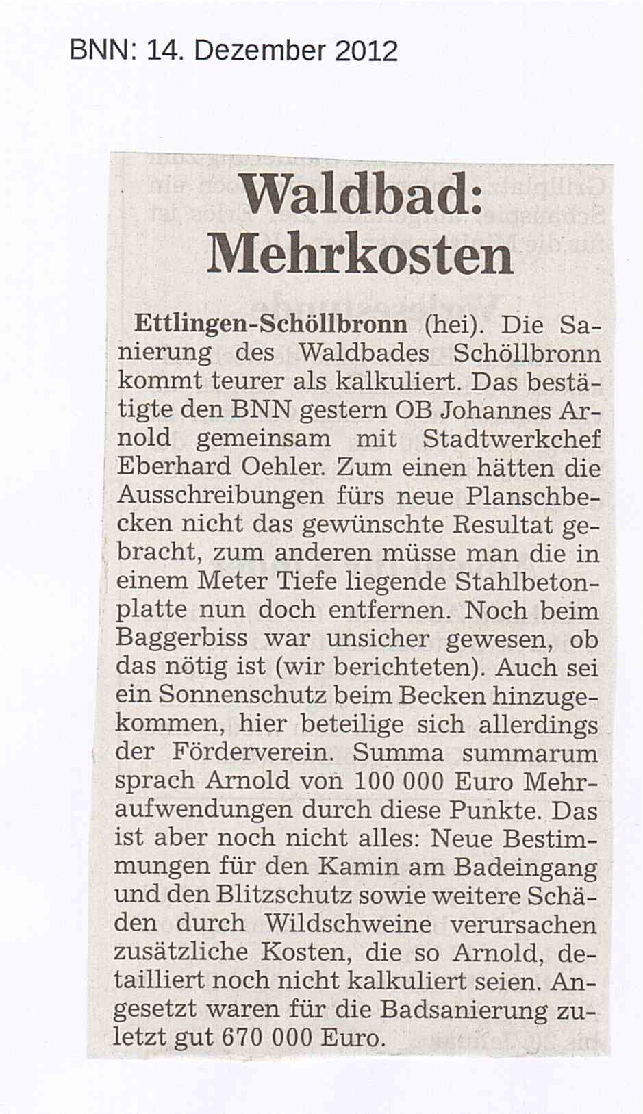 14. Dezember 2012 BNN: Waldbad: Mehrkosten