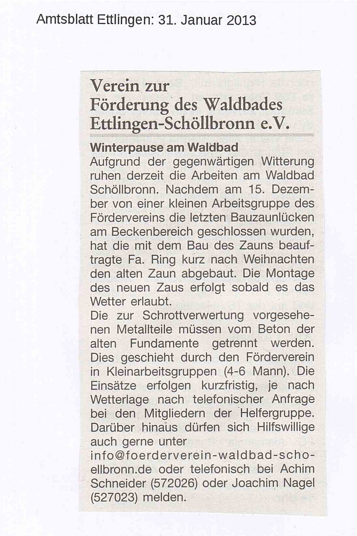 31. Januar 2013 Amtsblatt Ettlingen: Winterpause am Waldbad